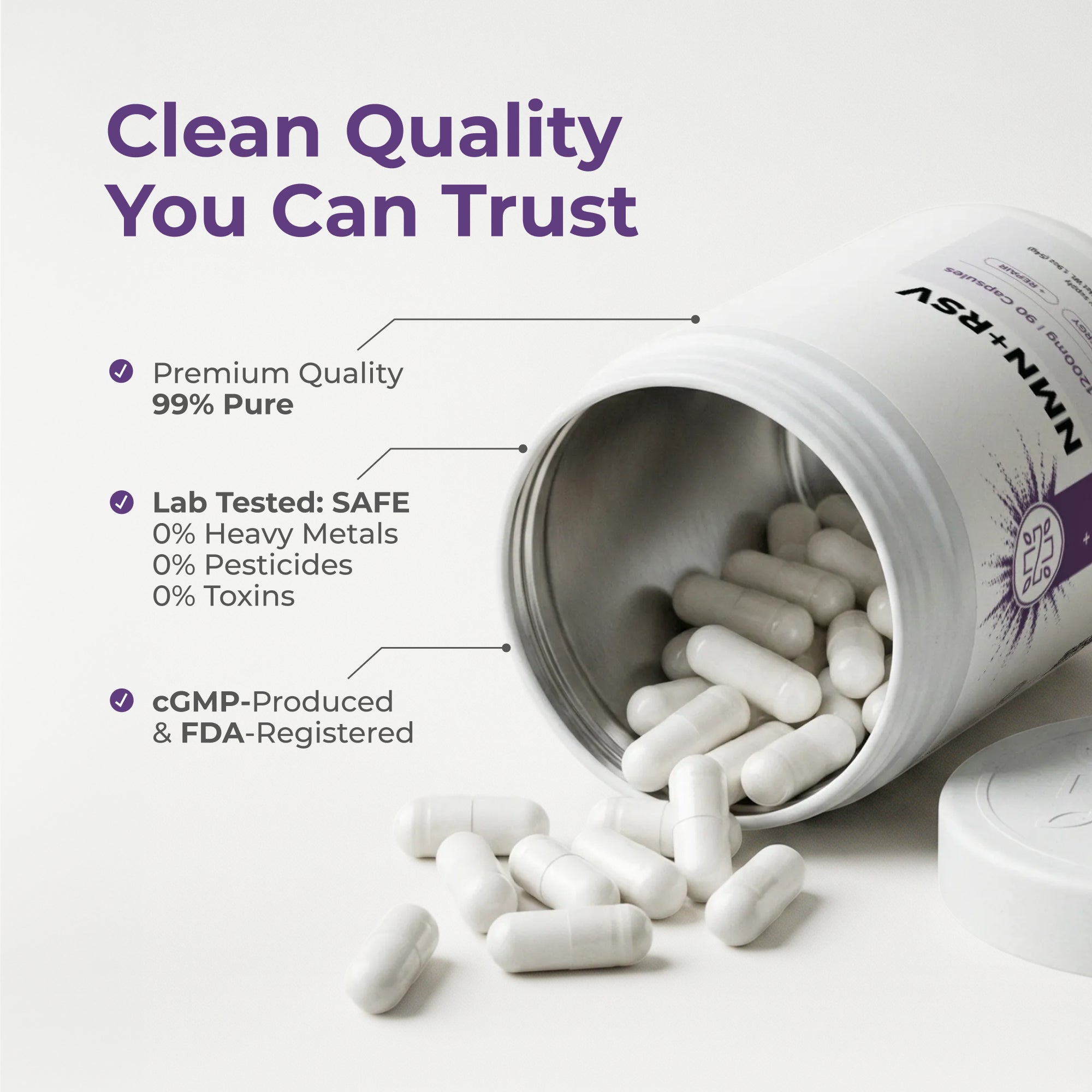 Nuestros Cápsulas de NMN + Resveratrol están probados en laboratorios externos para garantizar la máxima calidad, pureza y seguridad.